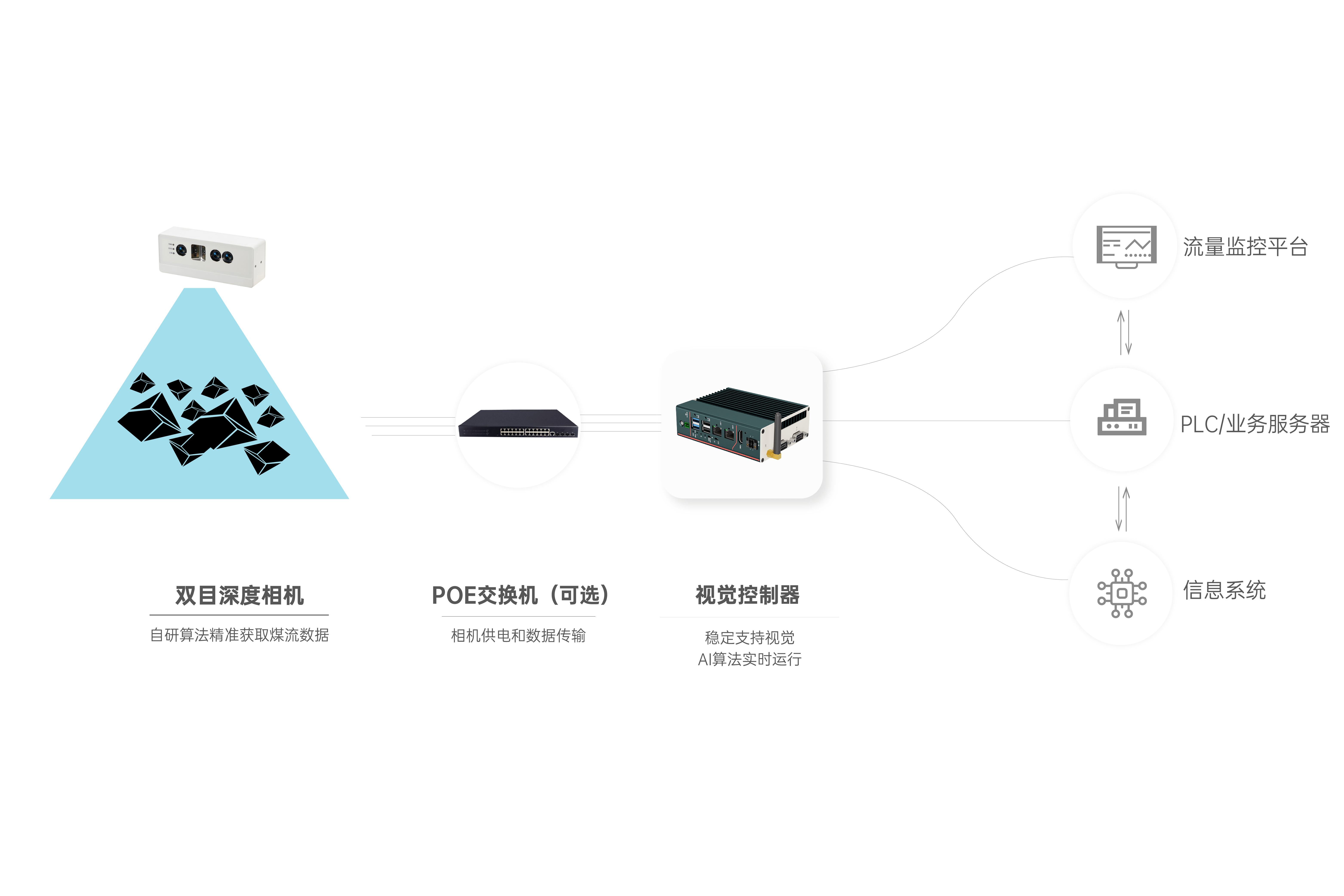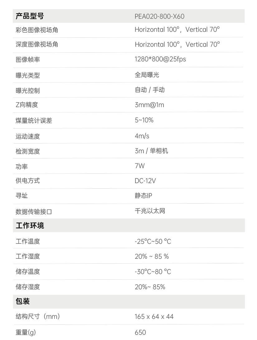 首页 动态 场景应用丨wm365完美智能煤流监测系统全新升级,赋能自动化煤流管控 场景应用丨wm365完美智能煤流监测系统全新升级,赋能自动化煤流管控 场景应用 2024-07-08 浏览量:2242 煤矿行业中,生产安全和节能降耗是两大痛点问题,在实际运煤过程中,跑偏、摩擦生热、堆煤、皮带撕裂等故障常造成重大安全事故,运输轻载和空载仍匀速运行会出现“以小拉大、无效运转”,导致能源大量浪费。 目前,传统测量设备智能化检测程度低,维护人员多,人力成本高,影响生产效率;皮带秤是采用较多的称重仪器,而在体积测量场景不易直接实现,而激光三维扫描测重系统价格昂贵,难以普遍使用。 如何通过提升皮带输送机采集精准数据能力,减人降耗,提高安全防范,进行自动化管控成为煤矿行业亟待解决的问题。 wm365完美智能煤流监控管理系统,基于双目立体视觉技术实现精准的数据检测和输送带控制。系统由3D相机硬件、嵌入式计算平台、流量监测平台构成,实现输送带煤量监测统计,堆煤监测、块煤监测、异物监测、跑偏监测、撕裂监测等功能,以采集的精准数据为智能调速、皮带运输安全检测等智能化改造提供助力,达到减人增效,节能降耗的目标。该系统环境环境适应强,部署简单,无需改造现场环境即可安装。 司眸®智能煤流监测管理系统应用于某煤流监测项目 产品介绍 wm365完美智能煤流监测管理系统采用自研非接触智能煤流RGBD相机,搭载输送机煤流监测智能管理平台,相机在AI算法加持下,能实时采集到高质量煤流RGBD数据,实现高速运输的煤炭皮带机进行多种智能化场景应用,易于部署,通过千兆网口直接对接PLC或服务器,安装便捷,无需改造现场环境,对环境光适应性强,不易受皮带颜色信息干扰。 系统应用功能 煤流统计 通过智能煤流RGBD相机采集动态输送机上的煤矿体积的三维数据,输出深度和彩色数据信息。该功能还可应用于输送带智能调速,生产数据管理,库存管理等智能化升级改造。 支持皮带速度:4m/s 粉煤煤量统计误差:≤5% 块煤监测 通过立体视觉技术,测量块状物的长宽数据,识别大块煤,输出高精度数据。 支持皮带速度:4m/s 异物监测 通过智能算法可识别大块矸石、铁器(锚杆、角钢)等非煤异物。 煤堆监测 在出料口、传送带上实时监测堆煤高度,实时输出堆煤结果。由此实现输送机安全监控,提前预防堆煤事故发生。 堆煤高度检测精度:毫米级 检测周期:秒级 最佳检测皮带宽度:600~2400mm 跑偏监测 根据智能相机安装位置定位皮带边缘位置,进行位置标定及设定跑偏阈值,通过获取的输送带三维尺寸位移信息,对皮带左右边缘位置与阈值比较并进行跑偏判断,输出跑偏结果。 左右皮带边缘定位精度:毫米级 检测周期:秒级 最佳检测皮带宽度:600~2400mm 智能煤流RGBD相机特点 01 高精度测量,保障数据准确 在高速动态检测上,测量精度可达毫米级,测量结果与实际煤量误差小于5%; 支持设备端断网续存,联网后相机前端与后台系统可保持数据同步。 02 适应性高,鲁棒性强,复杂场景可运行 抗强光、反光干扰:可抗强光、反光,自研算法支持煤矿等深色、黑色物体精准测量; 抗阴影干扰:在室内、地下、夜晚能稳定测量,无需补光; 多类型输送机适配:可适配平直型、U型、V型等各类型输送机; 适应于矿场粉尘、煤炭表面有水渍的情况; 结合算法对皮带输送时产生的震动进行自适应调整,减少测量误差; 针对井下场景可选用防爆硬件及井上应用工业级硬件设备,满足应用需求。 03 部署简单,安装便捷 出厂相机内参标定,可快速部署集成,无需改变现场环境即可安装,实施速度快,调试简单,系统易于维护。 04 接口丰富,数据直传 丰富的系统对接接口,可直接对接PLC、变频器、服务器,快速完成精细化皮带控制。 05 大景深、大视野,多范围应用 测量皮带宽度达2.4米; 测量煤堆高度达1.5米; 设备组合方案可支持更大视野。 05 边缘计算架构,实时测量 使用边缘计算架构,将多种智能算法在边缘端实现,保证数据实时传输。 RGBD相机参数 wm365完美深耕机器视觉领域近十年,垂直领域技术积累深厚,经过长期自主研发,现已推出系列体积测量方案,包括智能煤流监测管理系统、RGBD大货体积测量、动态包裹体积测量、静态包裹体积测量等,能够满足各领域不断增加的业务需求。 我们一直秉持以服务客户为中心,将技术与产品创新作为对客户、行业和社会应尽的责任。未来,wm365完美将坚持科技创新,始终致力于数字化转型升级及智能化发展,促进全社会生产效益提升。 上一个:场景应用丨wm365完美3D视觉+AI深度学习,助超大型货物体积测量更准,更稳,更易用 返回列表 下一个:3D机器视觉可以完成许多2D机器视觉无法完成的任务。 更多新闻推荐 端到端 更易用丨wm365完美®散料运输动态监测与预警系统全新上市 新品上市 2025-02-20 小尺寸 更灵活丨wm365完美3D相机PEA020-800-Y80S上新,助力多场景智造升级 新品上市 2024-09-29 目前主流3D视觉技术各有什么优劣势?如何选择最Match的工业3D相机? 技术科普 2024-08-12 【最全选型攻略】挑选合适的工业相机,必须提前考虑12要素! 工业相机 2024-07-16 场景应用丨wm365完美3D视觉+AI深度学习,助超大型货物体积测量更准,更稳,更易用 场景应用 2024-06-04 超高读取 极致易用丨wm365完美发布RGBD动态包裹体积测量智能相机 新品发布 2024-04-26